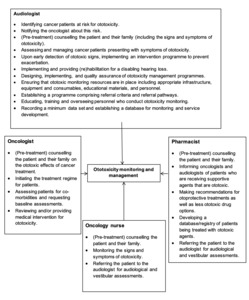 To ensure that the primary outcome of the programme is achieved, the ototoxicity monitoring programme needs to be facilitated by a multidisciplinary team (MDT).3,28 The MDT should comprise professionals involved in the management of cancer patients, including oncologists, oncology nurses, pharmacists, and audiologists.6,28,31 Other professionals who may form part of the MDT are social workers, clinical psychologists, ear, nose, and throat specialists, physiotherapists, occupational therapists, and speech-language therapists.6 Audiologists should drive the programme and patients should be at the centre of the programme.3,24,28