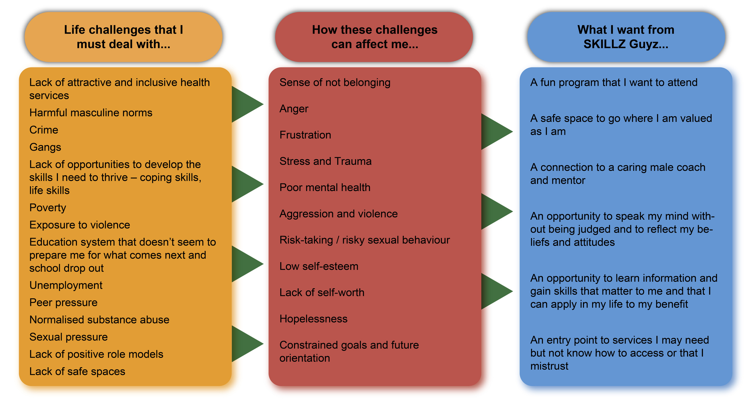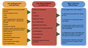 The SKILLZ Guyz participatory design workshop also yielded key takeaways for curriculum revisions. Participants brainstormed and prioritised challenges facing adolescent boys and young men, how those challenges affect them, and the characteristics of an appealing programme that could support them in addressing those challenges (Figure 2). This process helped to highlight and prioritise critical topics to address in the curriculum.