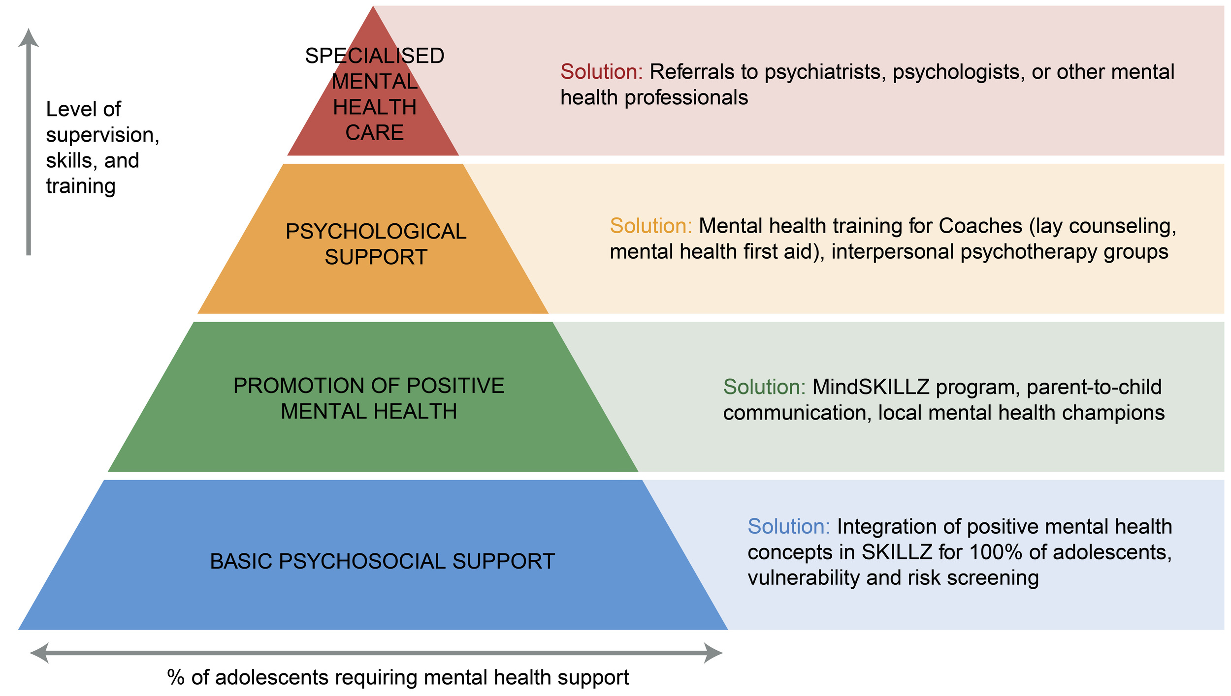 GRS focuses on the lower pyramid levels to provide basic psychosocial support and build mental health awareness. The focus at the lower levels, especially ‘basic psychosocial support’, is based on two premises: 1) all adolescents can benefit from basic support when it is integrated into adolescent health programmes, and 2) GRS coaches can be easily trained to provide this level of support through layering onto existing training.