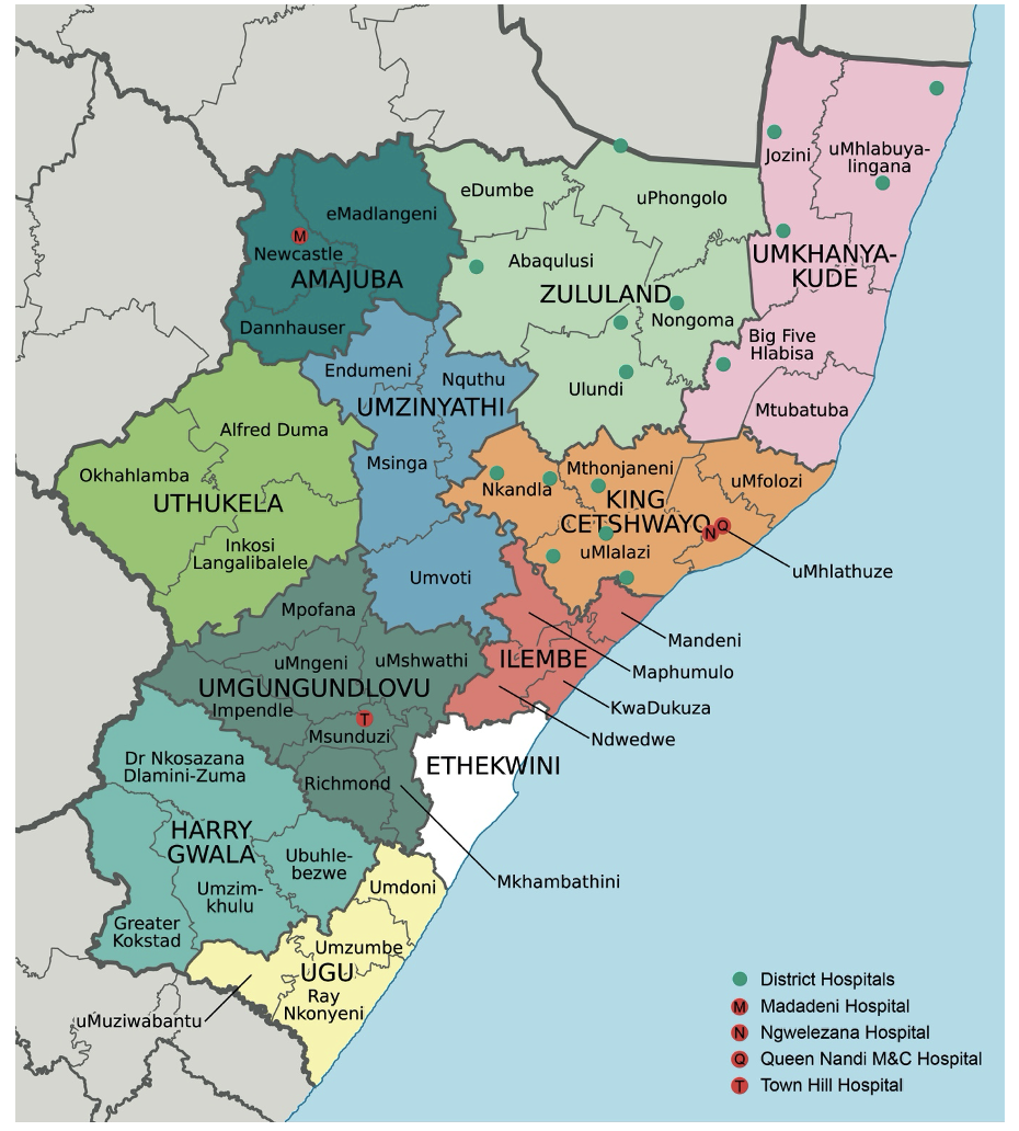 The northern part of KZN is predominantly rural, covering approximately 37 000 km2, with a population density of 84 people/km2. It includes the districts of King Cetshwayo, uMkhanyakude, and Zululand (Figure 1). The population of approximately 3 million people, 2.3 million of whom are uninsured,26 is served by 16 district hospitals (DHs) and three community health centres (CHCs), which provide a base for many PHC clinics. These are supported by referral regional and tertiary level services provided by Ngwelezana Hospital and Queen Nandi Mother and Child Hospital. Covering distances between district and referral hospitals can require a drive of up to five hours.