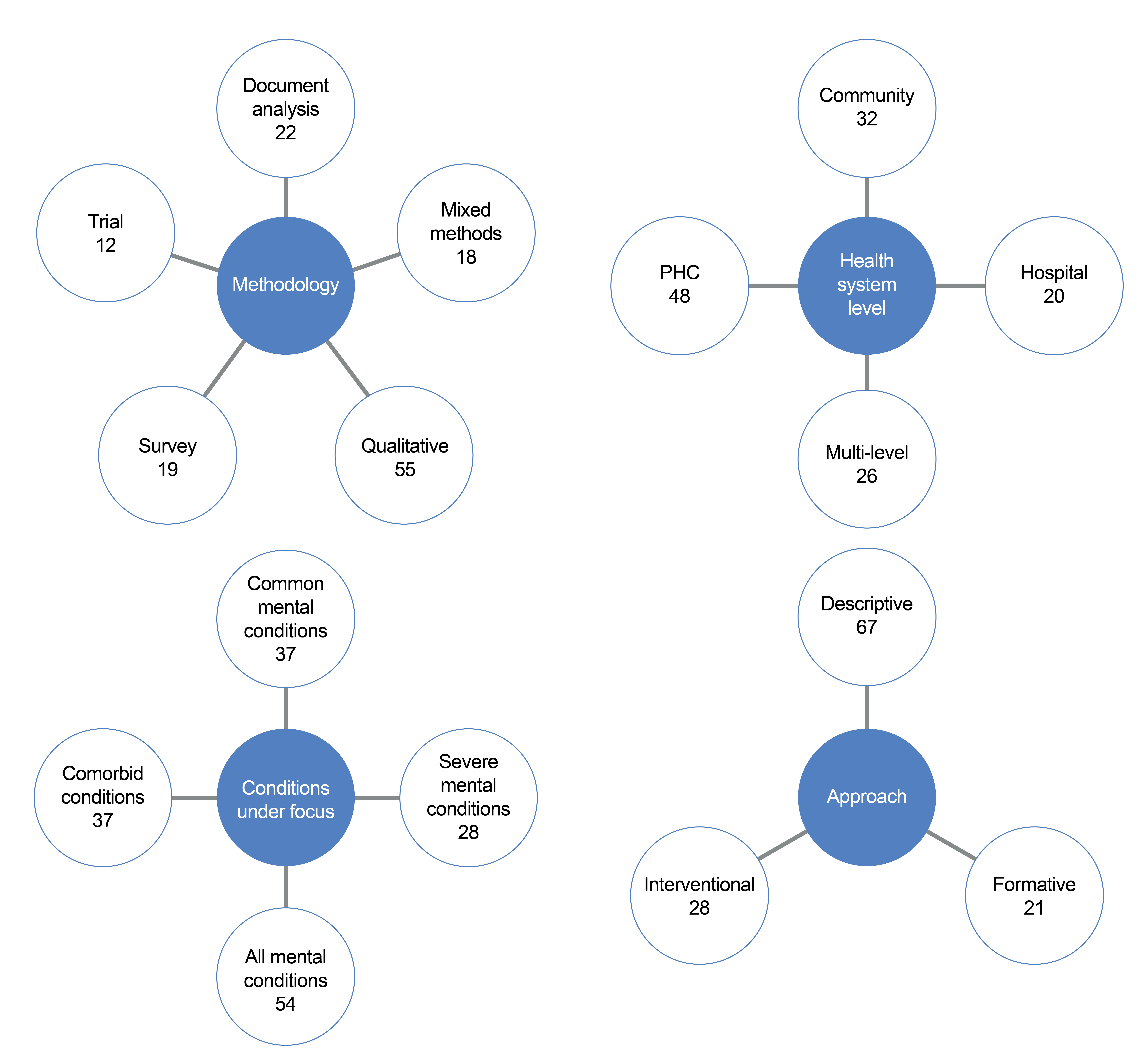 A total of 126 papers over the period of 13 years were included for final analysis (Table 1). As depicted in Figure 1, the bulk of papers used qualitative methodologies (n = 55), followed by document analysis (n = 22), surveys (n = 19), mixed methods (n = 18), and trial studies (n = 12). In terms of health-system level, 48 papers focused on PHC, followed by 32 at community level, with fewer studies with a multi-level focus (n = 26) and hospital focus (n = 20). A relatively large proportion of papers focused on non-specified mental health conditions (mental health care in general; n = 54), followed by common mental health conditions such as depression, anxiety, and substance abuse (n = 37), severe mental health conditions (n = 28), and comorbid conditions (n=7) as focus. A substantial proportion (n = 67) of the included studies were descriptive in nature (e.g. describing challenges, bottlenecks, and experiences related to mental health system structures and processes). Smaller proportions of the included studies featured the description, implementation and/or evaluation of intervention programmes (n = 38), with fewer involving formative research towards informing the development of interventions (n = 21).